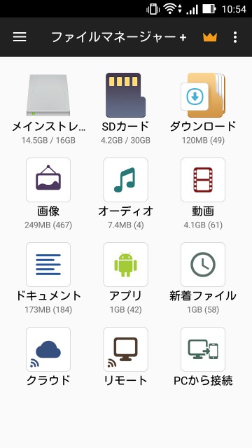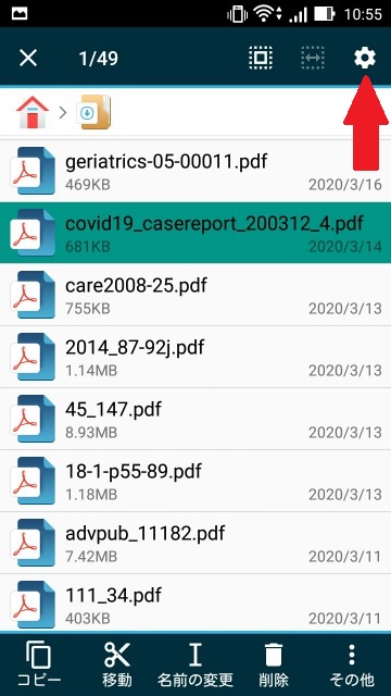 ファイルマネージャーを起動するとこのようなホーム画面が出てきますので、右上の『ダウンロード』アイコンをタップしてWEBページからダウンロードしたファイルを開きます。