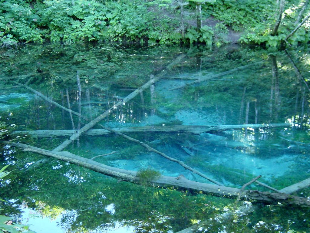 透き通った池の中は年間を通じて水温が8℃に保たれており、天然の冷蔵庫となっているために倒木が腐らずにそのままの姿で保存されています。