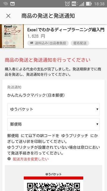 ここでは前提条件として、ラクマのスマホアプリを使用していること、発送方法にかんたんラクマパック(日本郵便)を選択していることとします。