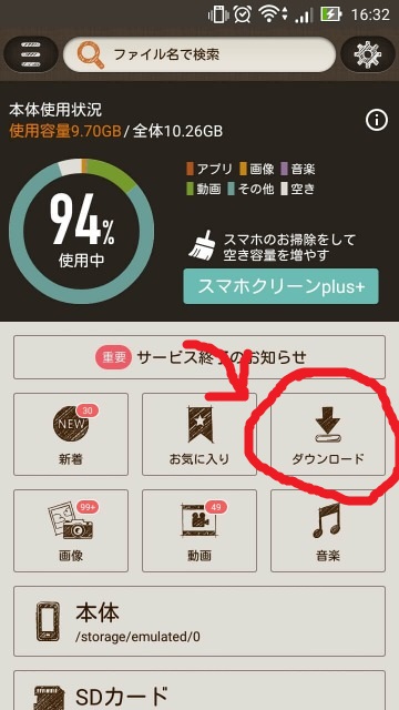 1.ファイルマネージャーを起動し【ダウンロード】アイコンをクリックする