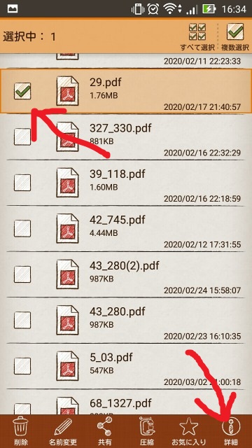 3.対象のファイルを選択し、右下の【詳細】をタップ