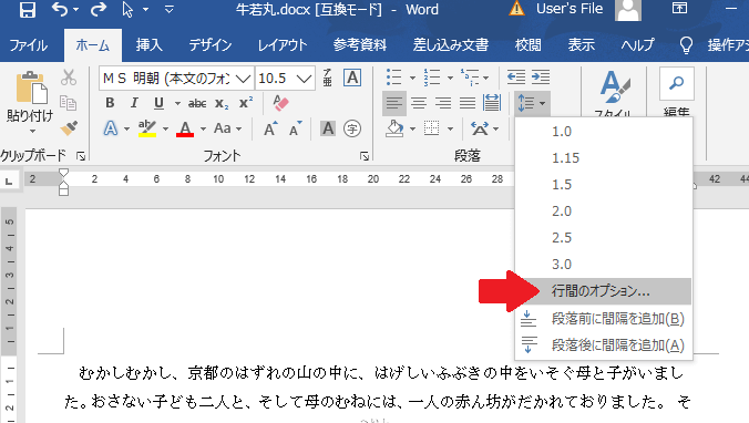 Wordのホームタブの中から行と段落の間隔をクリックし、行間のオプションへといきます。