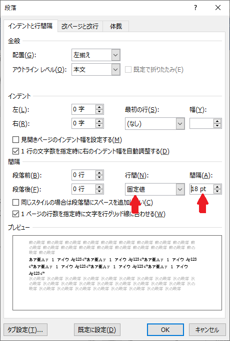 行間を「固定値」、間隔を文字サイズ+8ptほどに設定します。